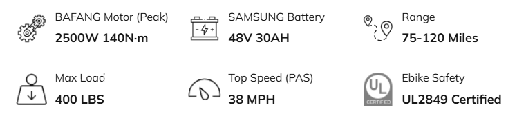 Feel the thrill of the 2500W BAFANG Peak Motor, achieving up to 38 MPH with pedal assist and 20 MPH on throttle. With 140 N·m of torque, it effortlessly conquers any terrain—perfect for commuting, weekend rides, and off-road adventures.